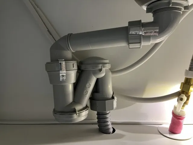 シンク下の排水ホースは、経年劣化で柔軟性を失い硬化します。硬くなったホースは振動などで排水口からズレやすく、接続部に隙間が生じます。また、硬化が進むとわずかな衝撃で亀裂が入り、漏水の原因となります。
