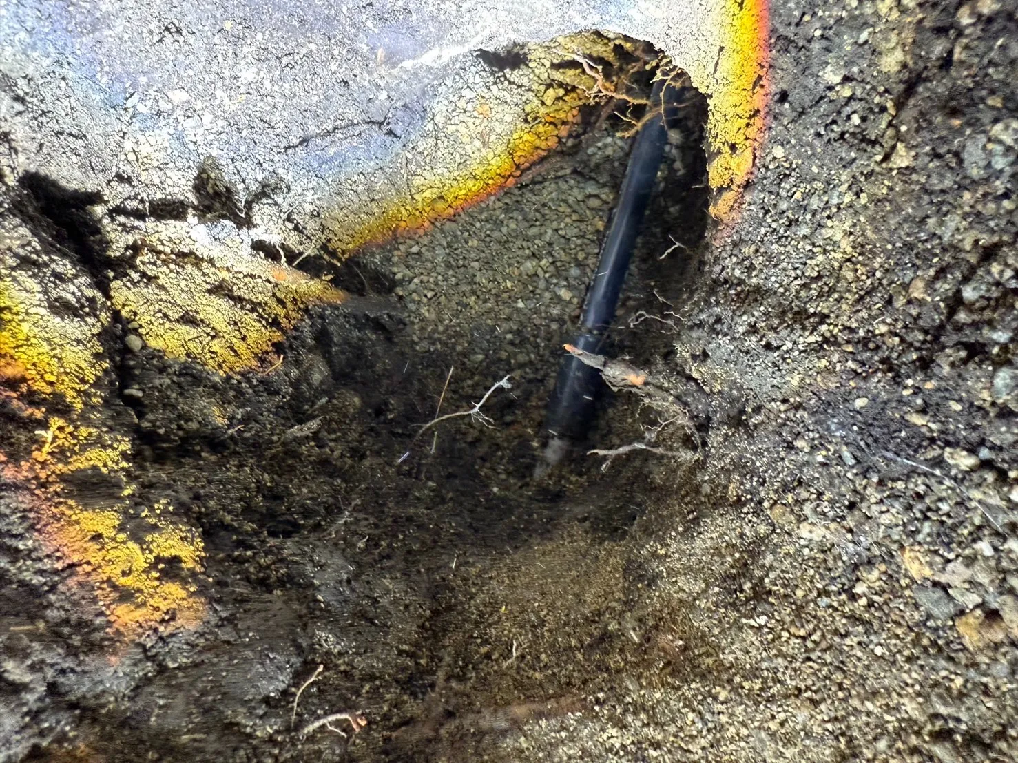 状況 | 敷地内にある住居部分の床下での塩ビ菅の破損 |