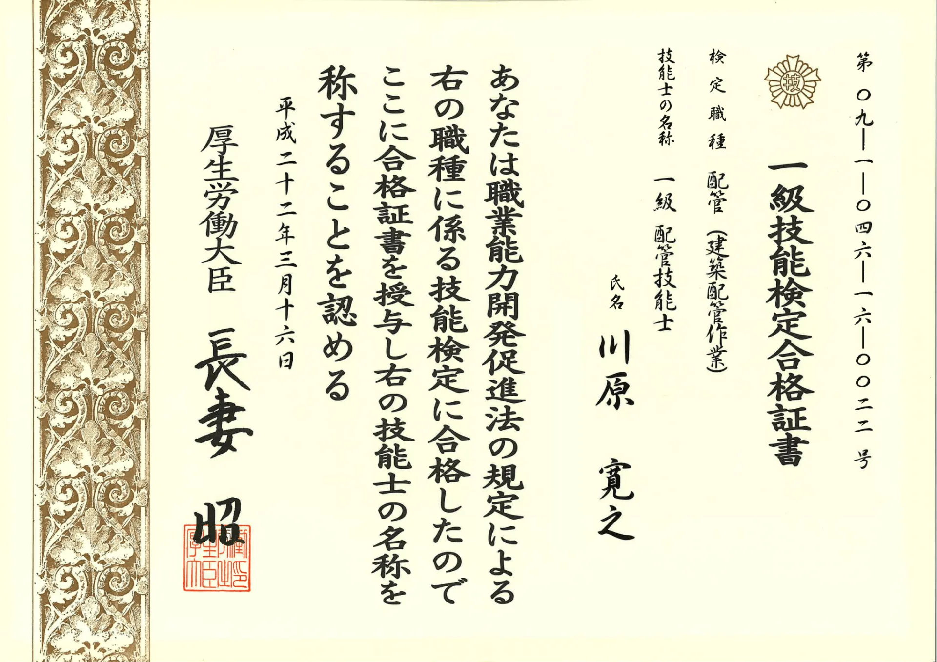 水道・ガス配管工事の分野での専門知識と経験を基に、平成27年に株式会社川原設備を設立。