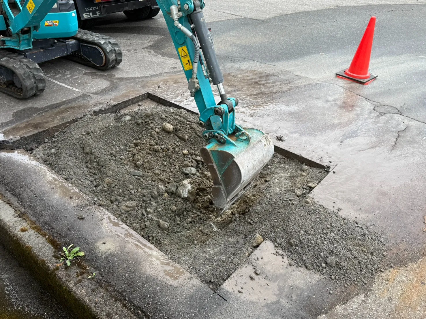 修理方法 | アスファルトにカッターをいれて、ショベルカーで掘削。 漏水箇所を露出し、埋設用の鋼管に交換。 |